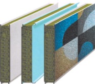 оцинкованного и стального окрашенного листа, а так же слой из плит с поперечными волокнами или из пенополистирольных плит. Сэндвич-панели с наполнителем и тонколистовой металлической облицовкой, называют строительными сэндвич-панелями, и используются для строительства несущих конструкций. Сэндвич-панели состоят из теплоизолирующего сердечника (поглощающего шум и впитывающего воду), и внешнего слоя (состоящего из металла), который выполняет следующие функции: защитную, декоративную и конструктивную.